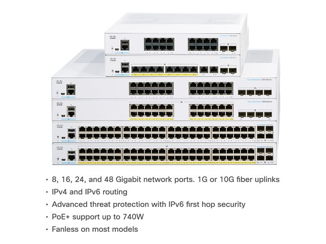 Cisco Business 350 Series-switchar är prisvärda hanterade switchar som ger viktiga byggstenar för alla små kontorsnätverk. Intuitiv instrumentpanel förenklar nätverksinställningen och avancerade funktioner påskyndar digital omvandling, medan genomgripande säkerhet skyddar affärskritiska transaktioner. Cisco Business 350 Series-switchar ger den perfekta kombinationen av prisvärdhet och kapacitet för små kontor och hjälper dig att skapa en effektivare, bättre uppkopplad arbetsstyrka.